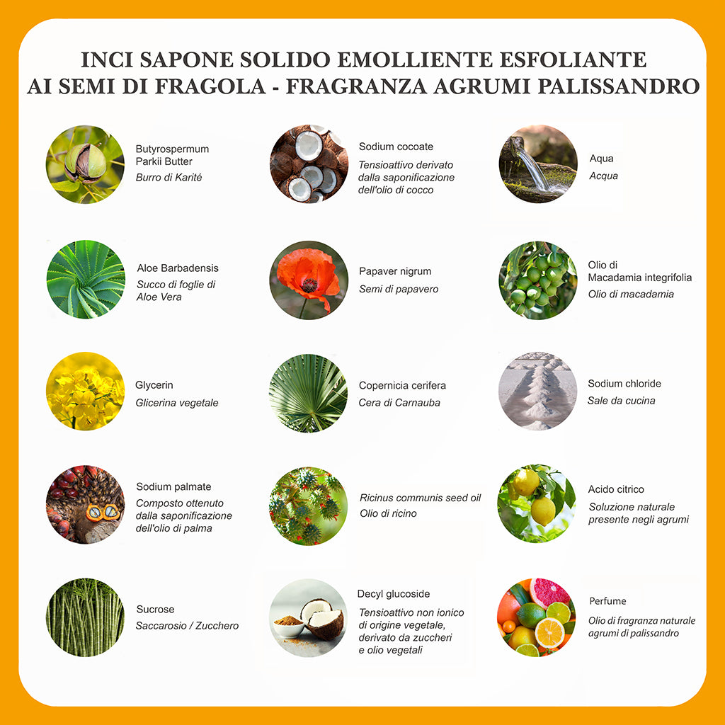 Butyrospermum parkii butter, Aloe Barbadensis , Glycerin, Sodium palmate, Sucrose,Sodium cocoate, Fragaria Ananassa, Copernicia cerifera, Olio di Ricinus communis, Aqua, Olio di Macadamia integrifolia, Decyl glucoside, Sodio cloruro, Acido citrico, Perfume Agrumi e Palissandro.